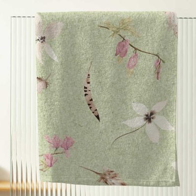 Gorgeous Sage Green Boho Bathroom Bath & Hand Towel Set With Boho Floral Pressed Flower Pattern, Cotton Terry Back & Velour Face