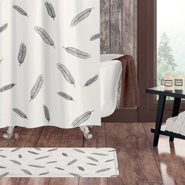 72 x 72 Black And White Boho Chic Shower Curtain With Feather Print – Contemporary Fabric Shower Curtain With Shower Rings And Hooks Included