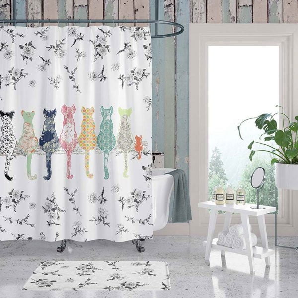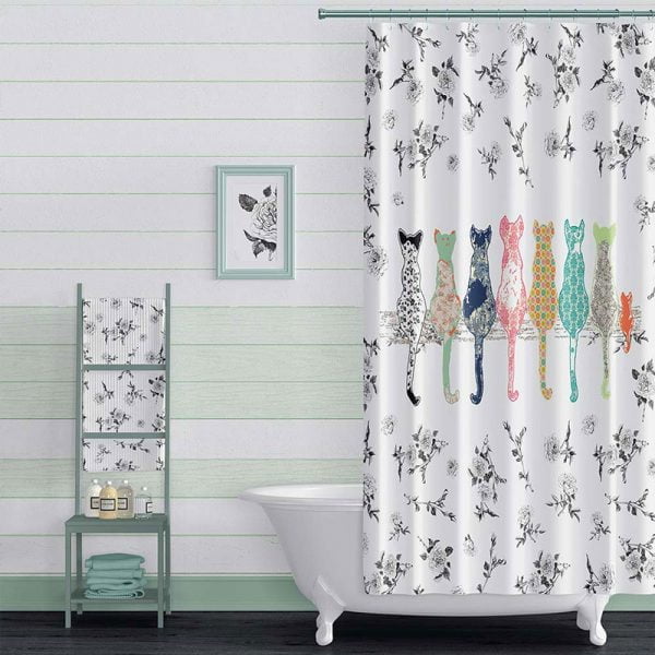 Floral Cats Print Shower Curtain – Exclusive Design, Waterproof Fabric, Washable & Includes 12 Hooks