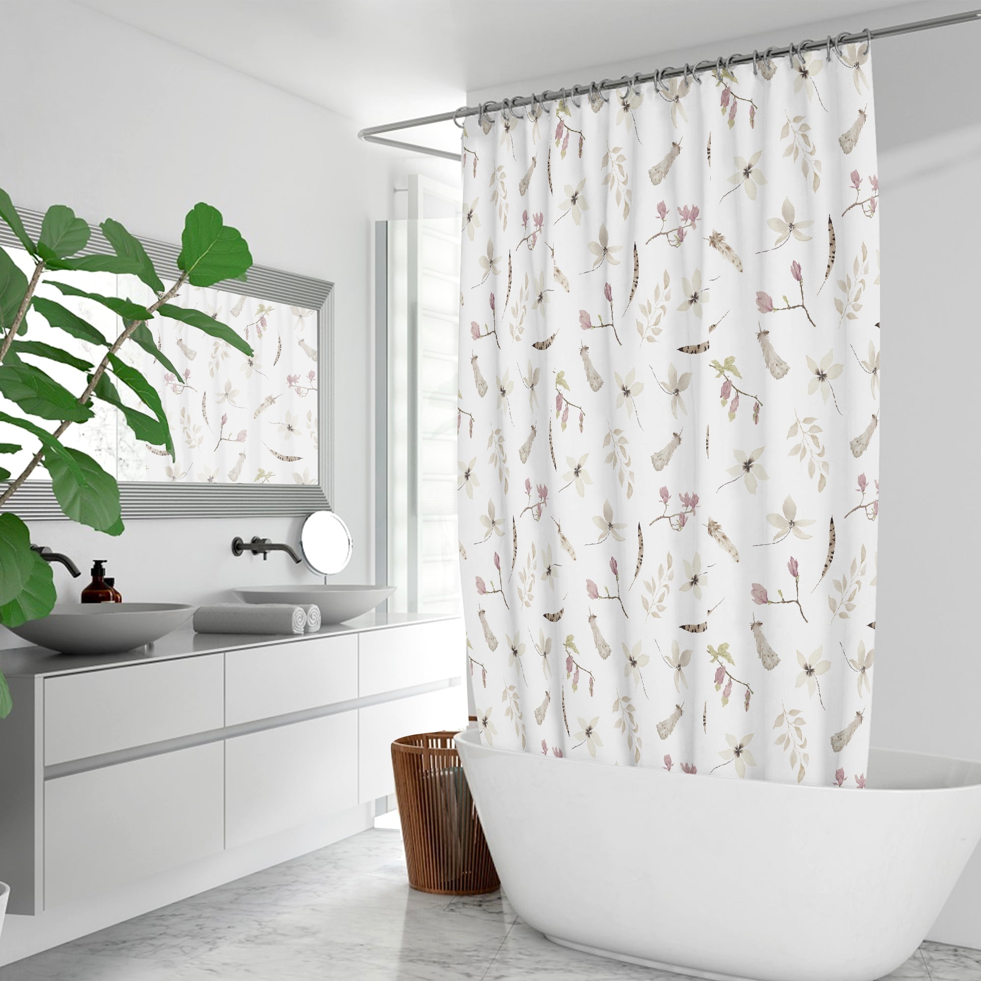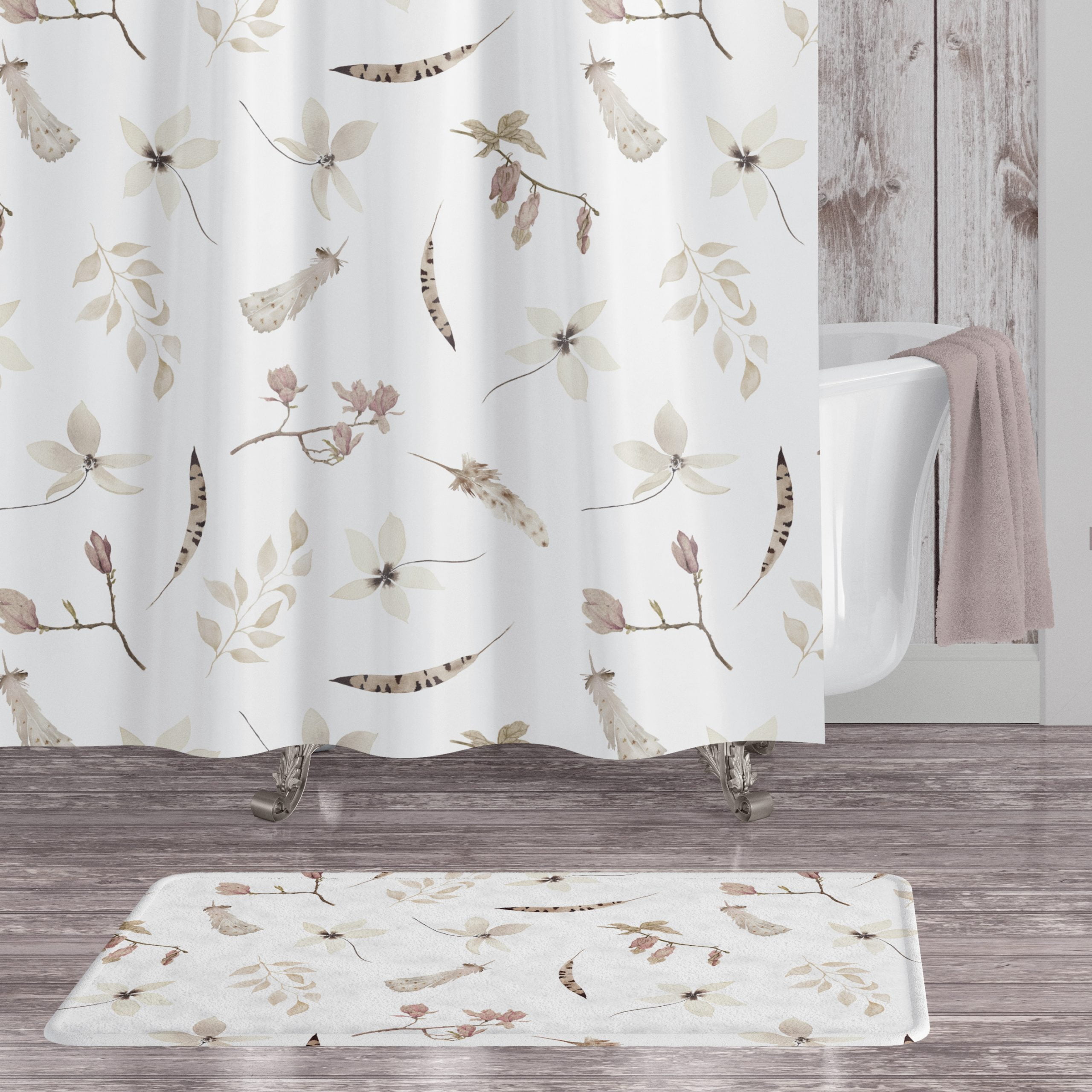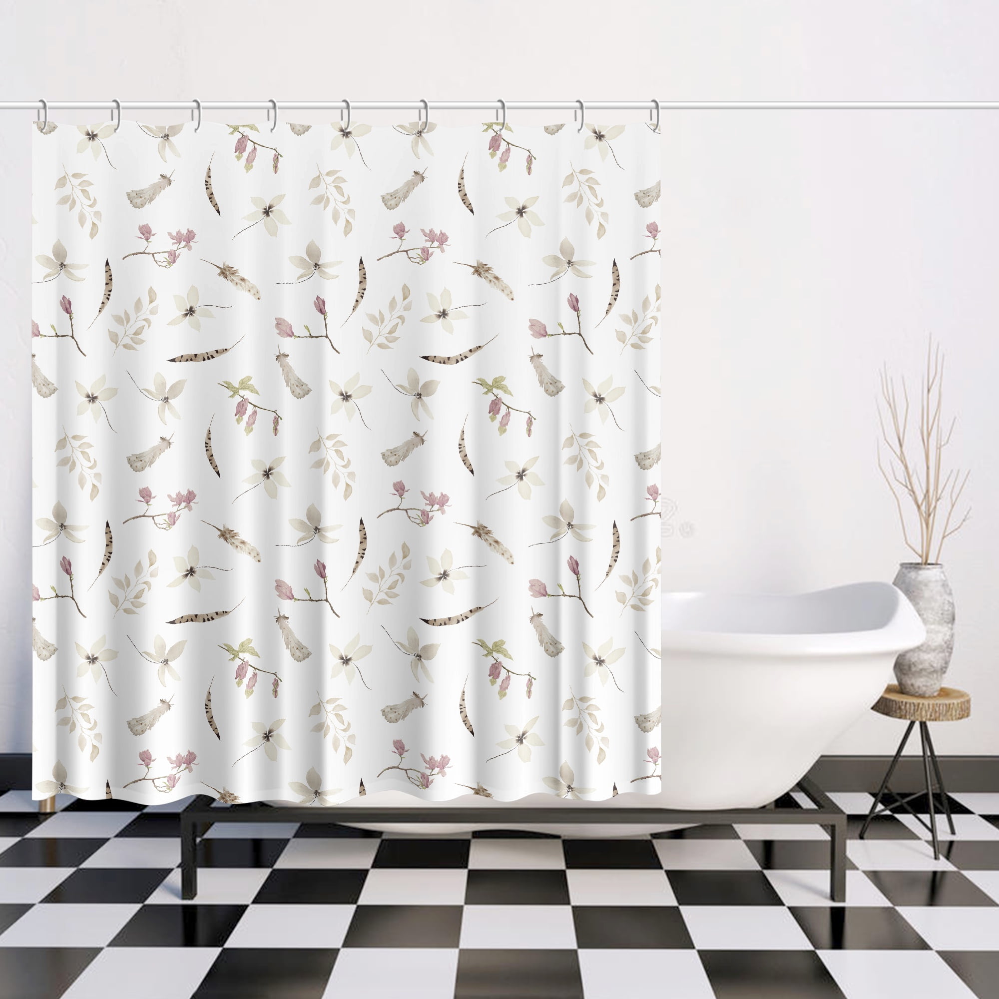 72 x 72 Boho Chic Floral Shower Curtain With Artist Designed Beige, Cream And White Pressed Flowers And Black And Brown Feather Print – Waterproof, Elegant Polyester Fabric – No Liner Required And Hooks Included.