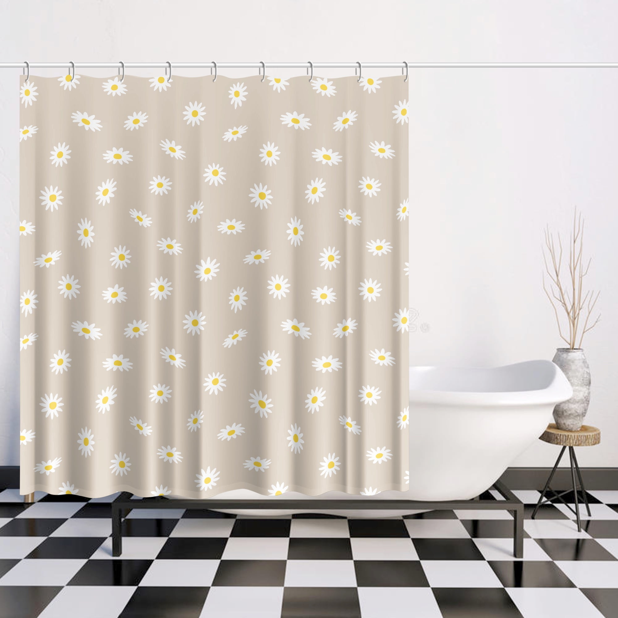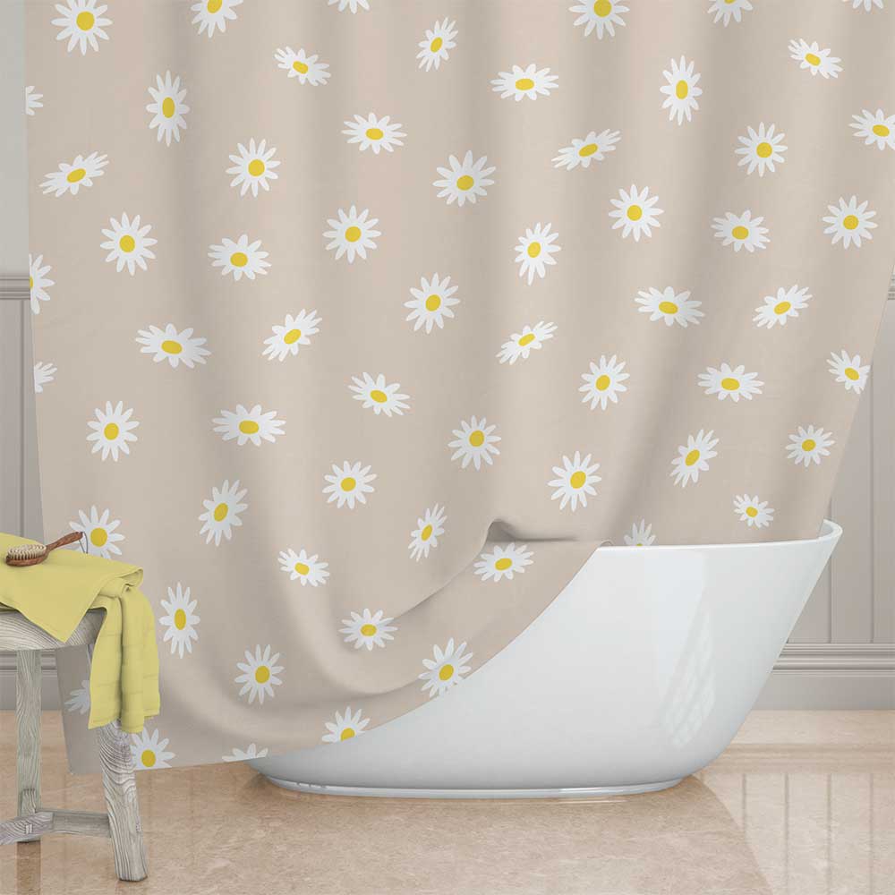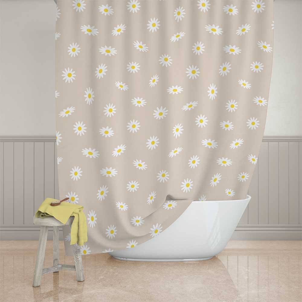 72 x 72 Daisy Flower Boho Shower Curtain – Water Repellent Beige Fabric Floral Shower Curtain With Rust Free Metal Grommets And Hooks Included – Machine Washable.