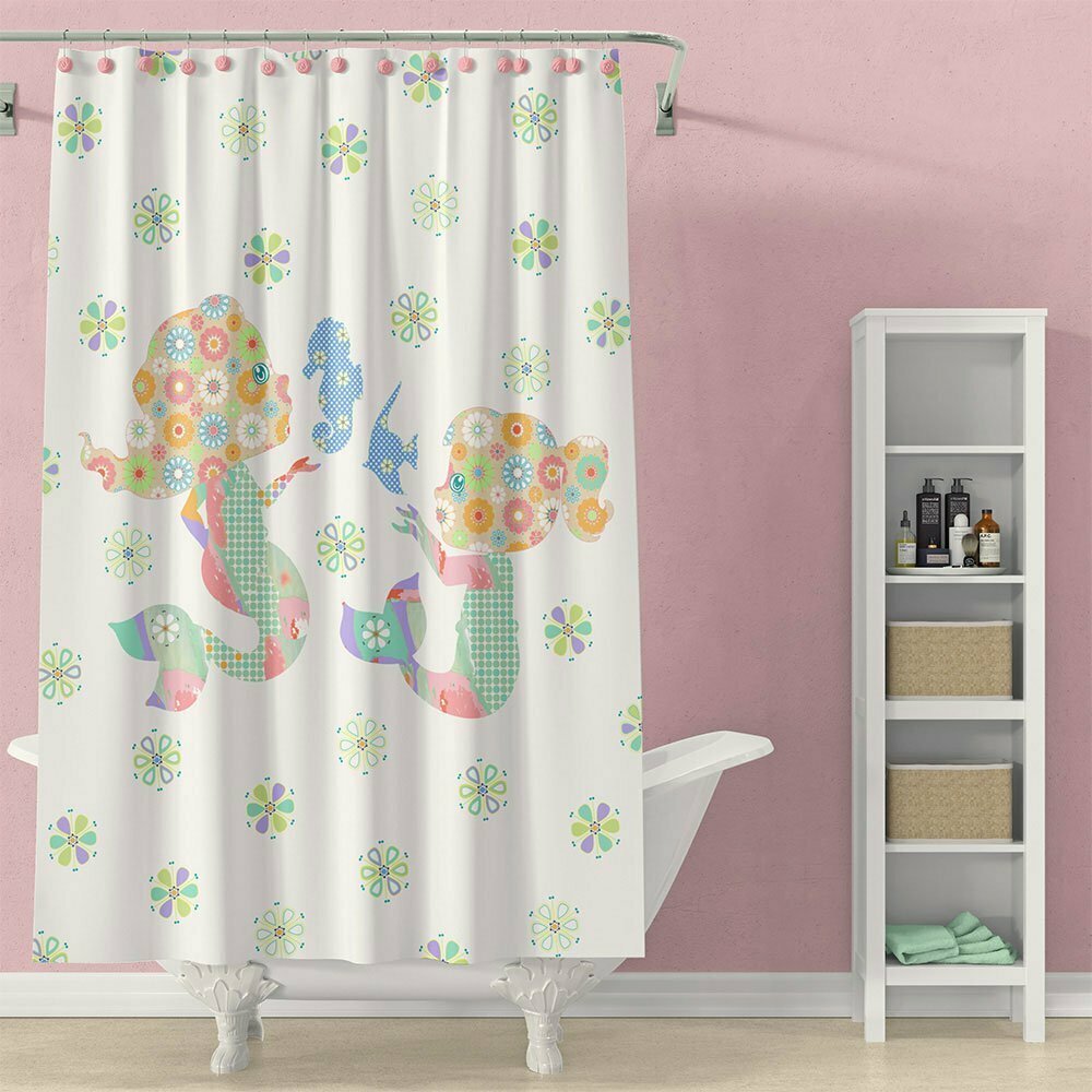 72×72 Cute Pink Mermaid Shower Curtain For Toddler Girls Bathroom Set -Waterproof Polyester Fabric, Includes 12 Hooks