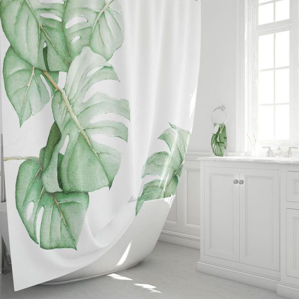 Artist Designed Green Monstera Palm Leaf Shower Curtain For A Tropical Beach Bathroom Vibe – Waterproof Fabric And 12 Hooks Included / Matching Bathroom Set Available