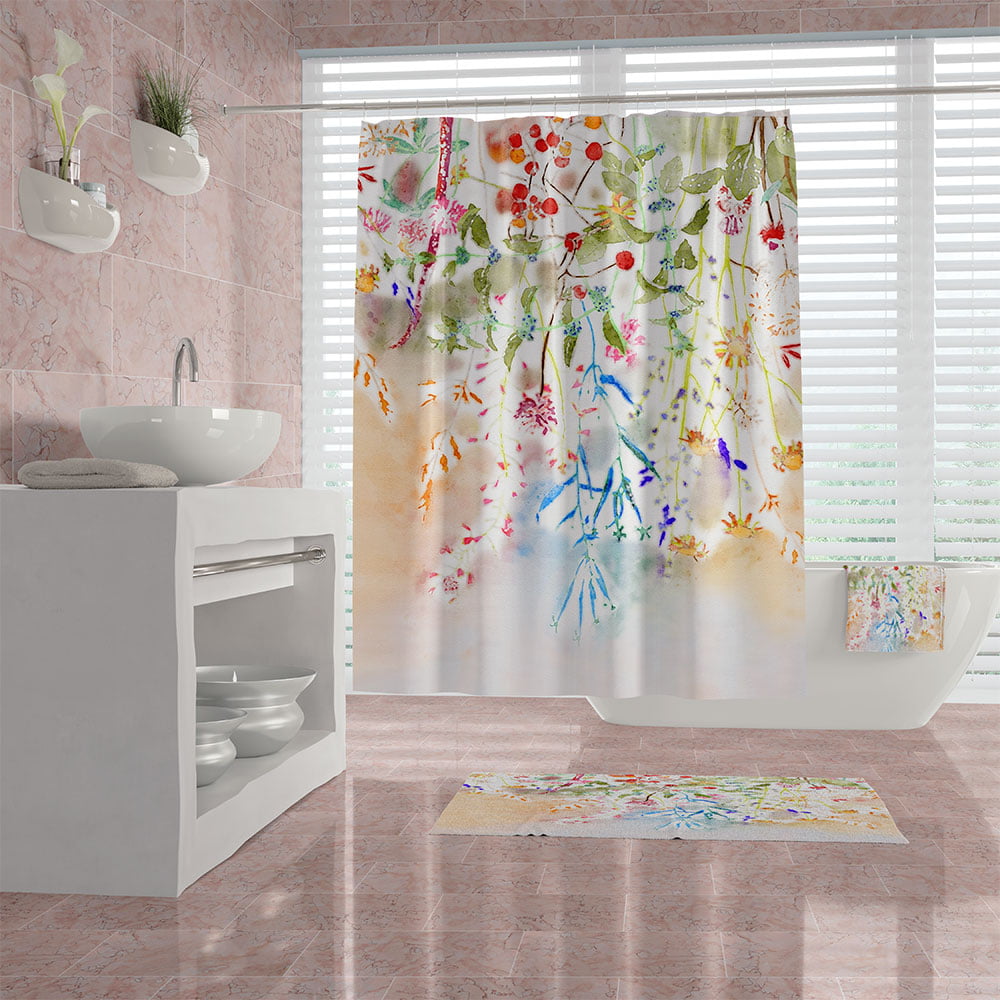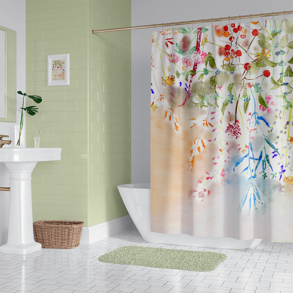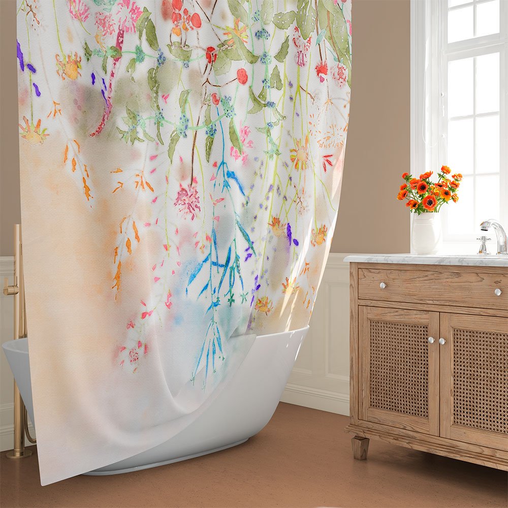 Artist Designed Watercolor Wildflower Floral Fabric Shower Curtain Set For A Modern Farmhouse Bathroom Vibe – Hooks Included