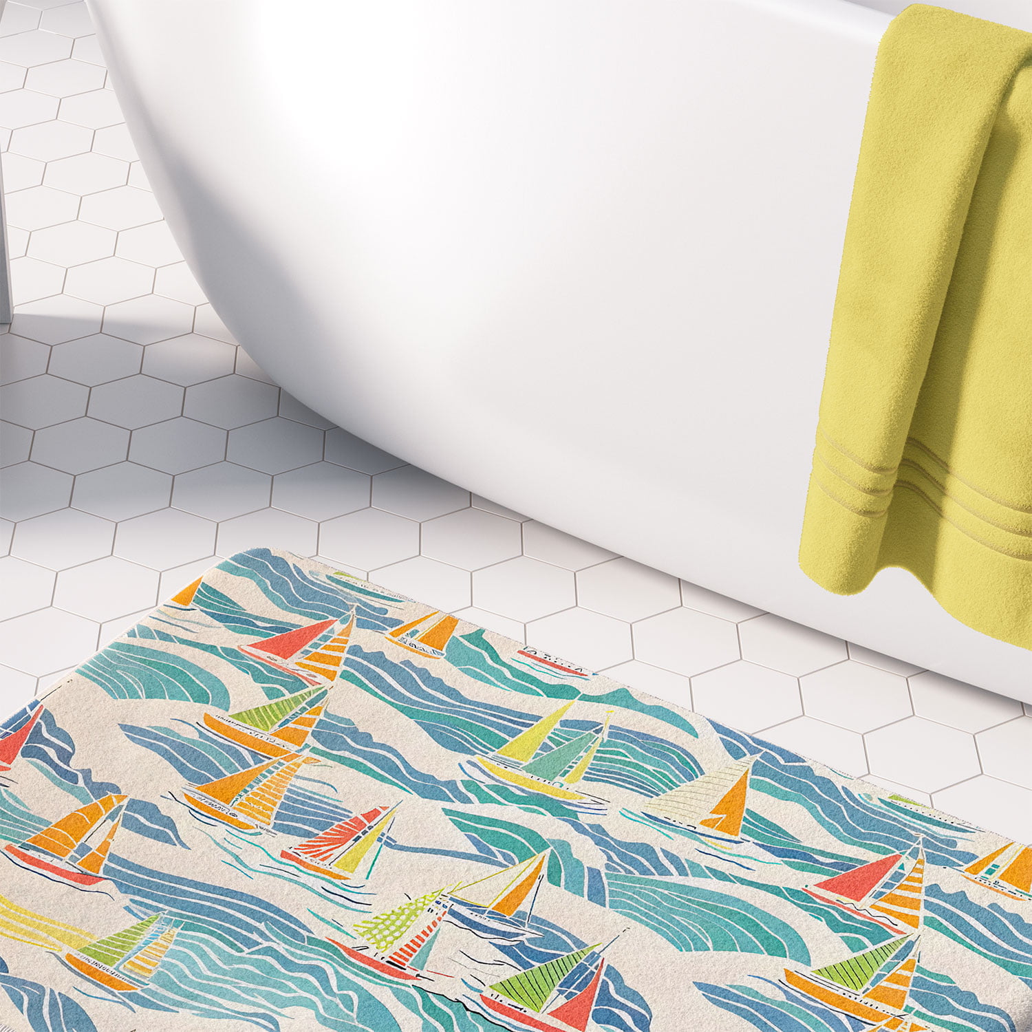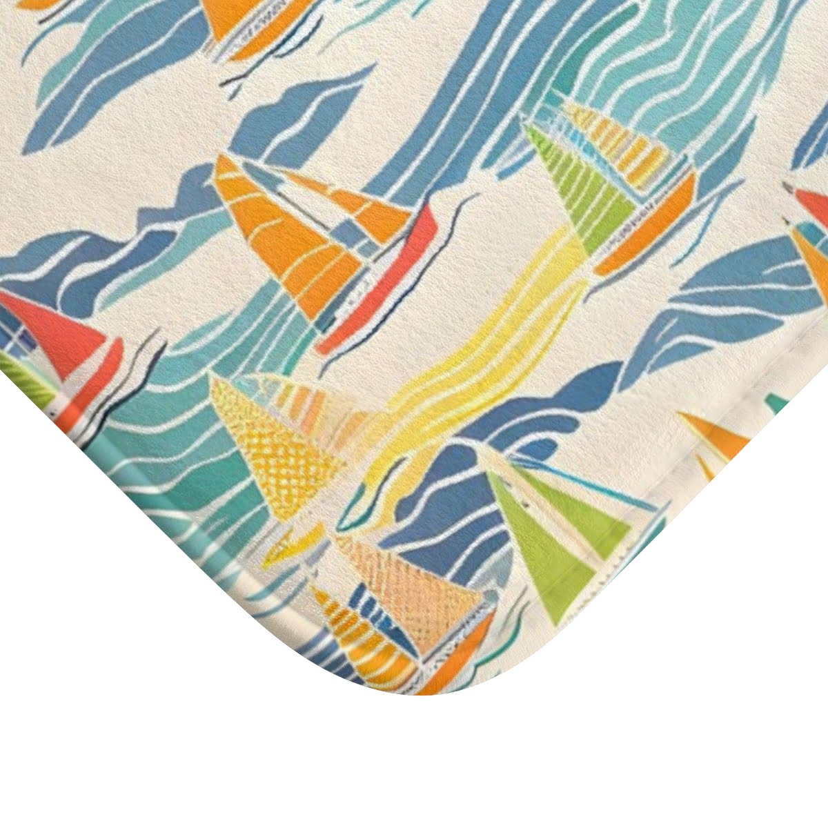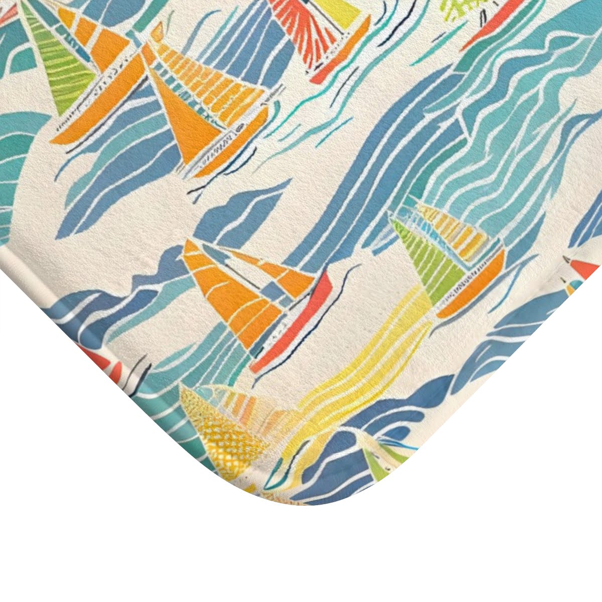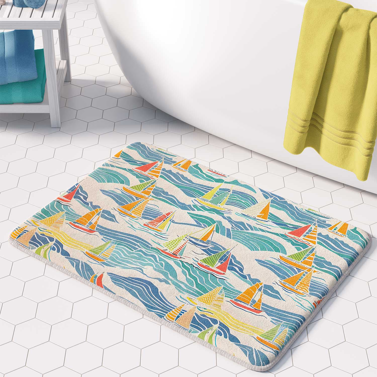 Beach Themed Non-Slip Microfiber Bath Mat With Unique Abstract Blue and Yellow, Red and Orange Sailboats – Mold Resistant, Quick Drying, Bathroom Set