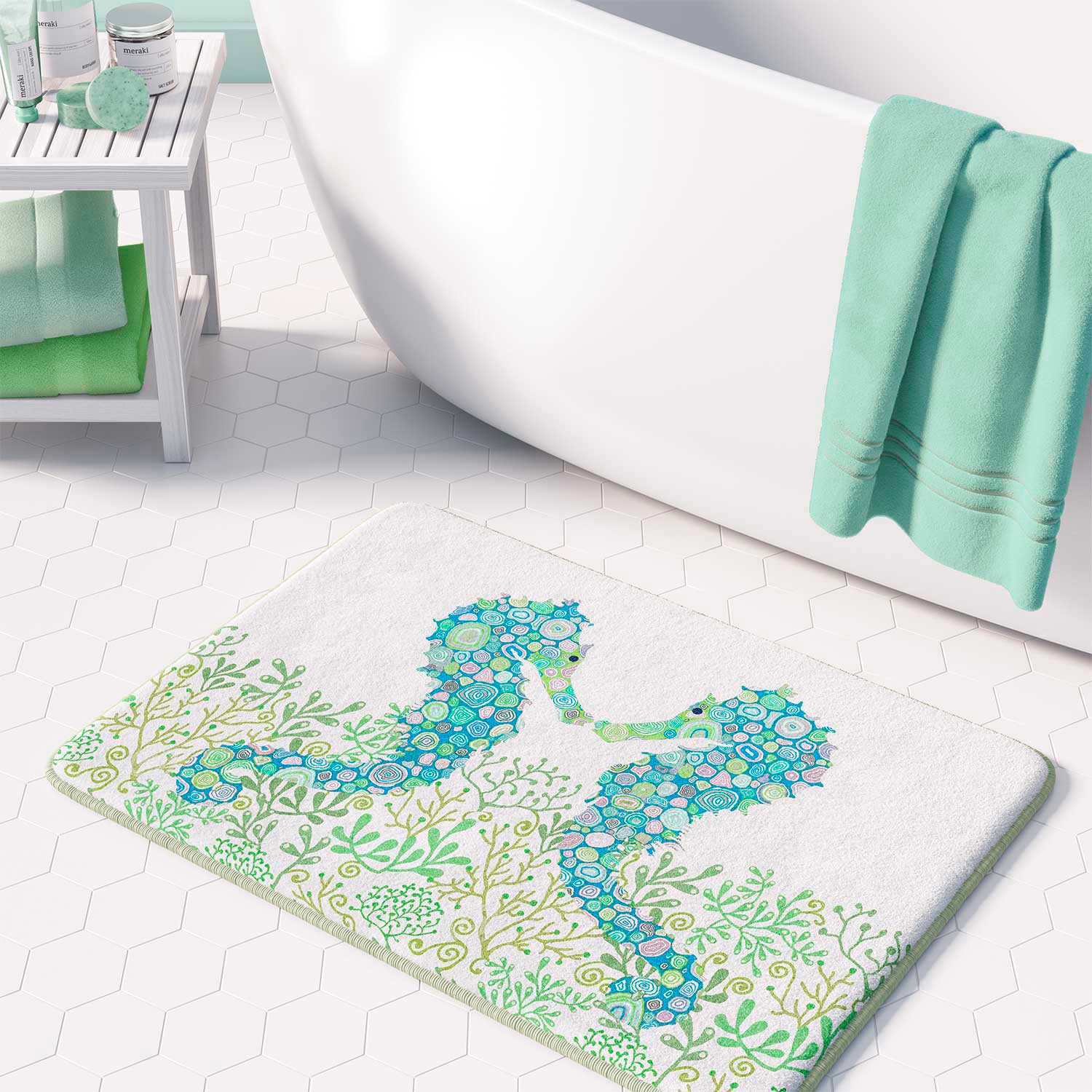 Blue And Green Seahorse Non Slip Super Soft Memory Foam Bath Mat For Kids Bathroom Decor