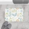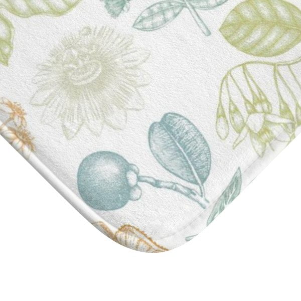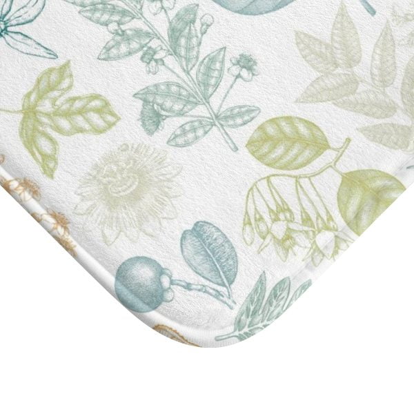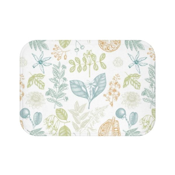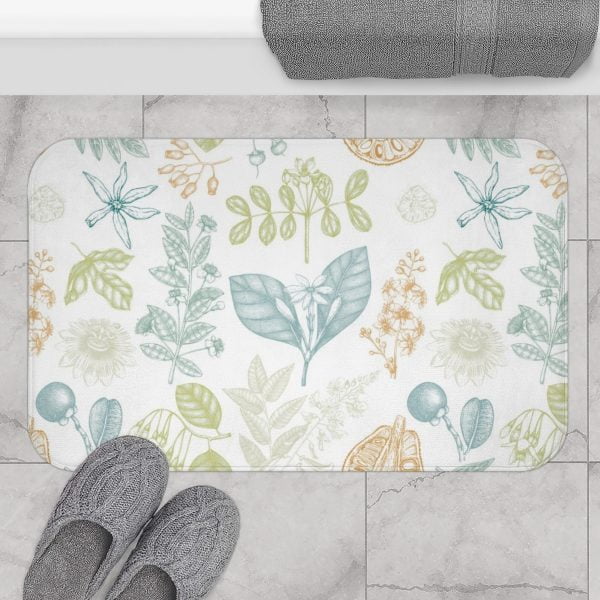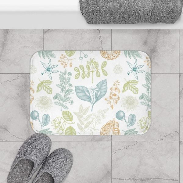 Elegant Non-Slip Super Soft And Comfortable Bath Mat With Eco Friendly Artist Designed Botanical Print For Nature Themed Bathroom. Water Absorbant, Mold & Mildew Repellent Washable Microfiber Surface Available in Bath Size 21″ x 34″ and Basin Size 24″ x 17″.
