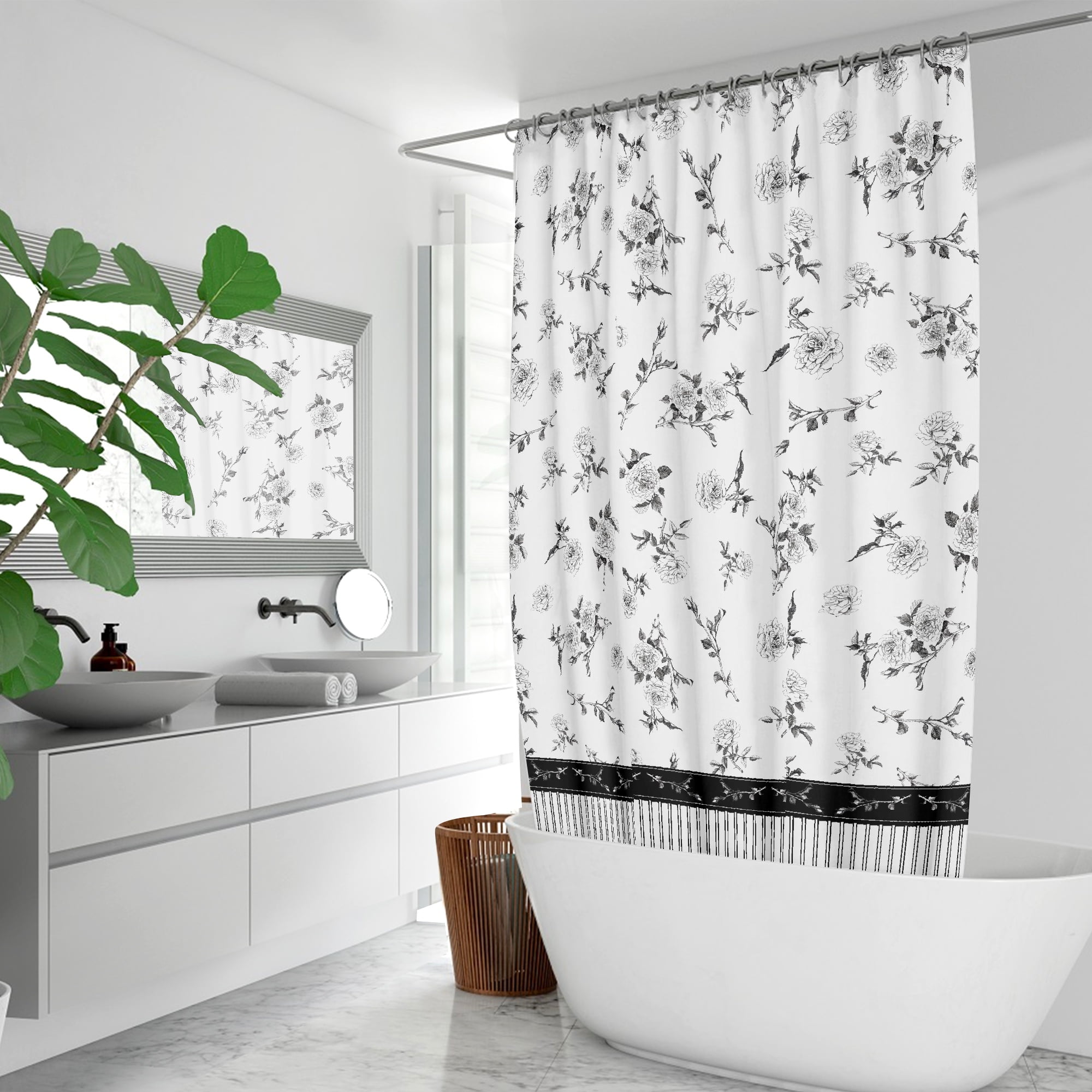 Black and White Floral Shower Curtain – Quick Drying 72 x 72 Water Repellent Fabric, Washable & Includes 12 Hooks