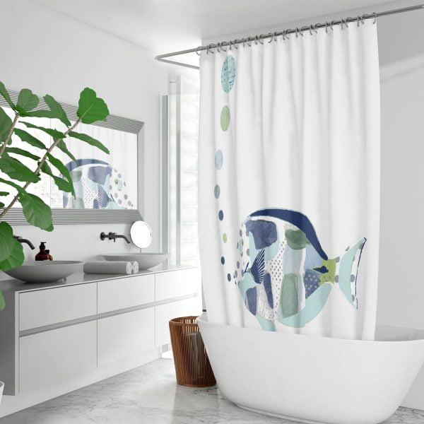 Kids Shower Curtain: Big Blue Fish Ocean Theme – Waterproof, Washable, 72×72, Hooks Included