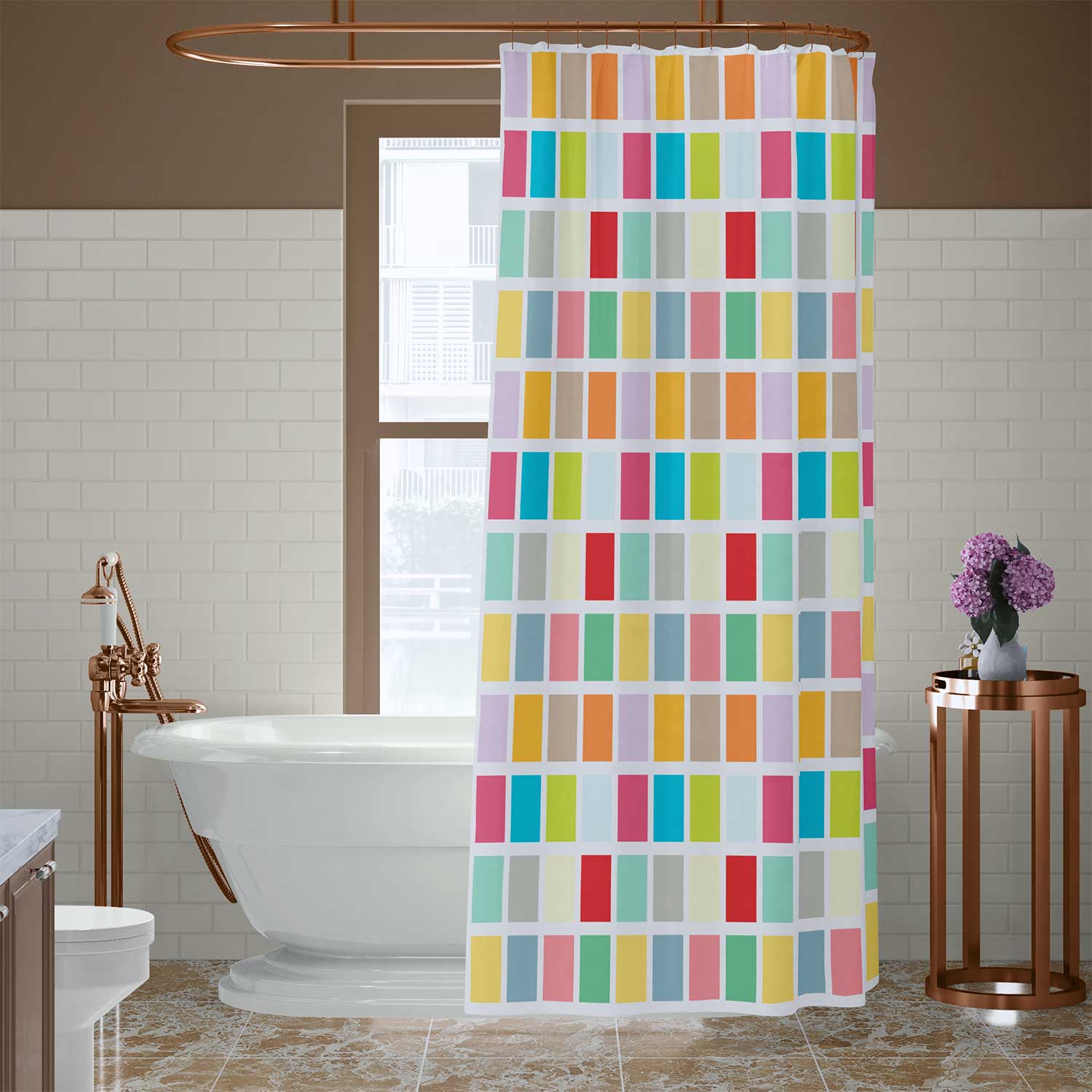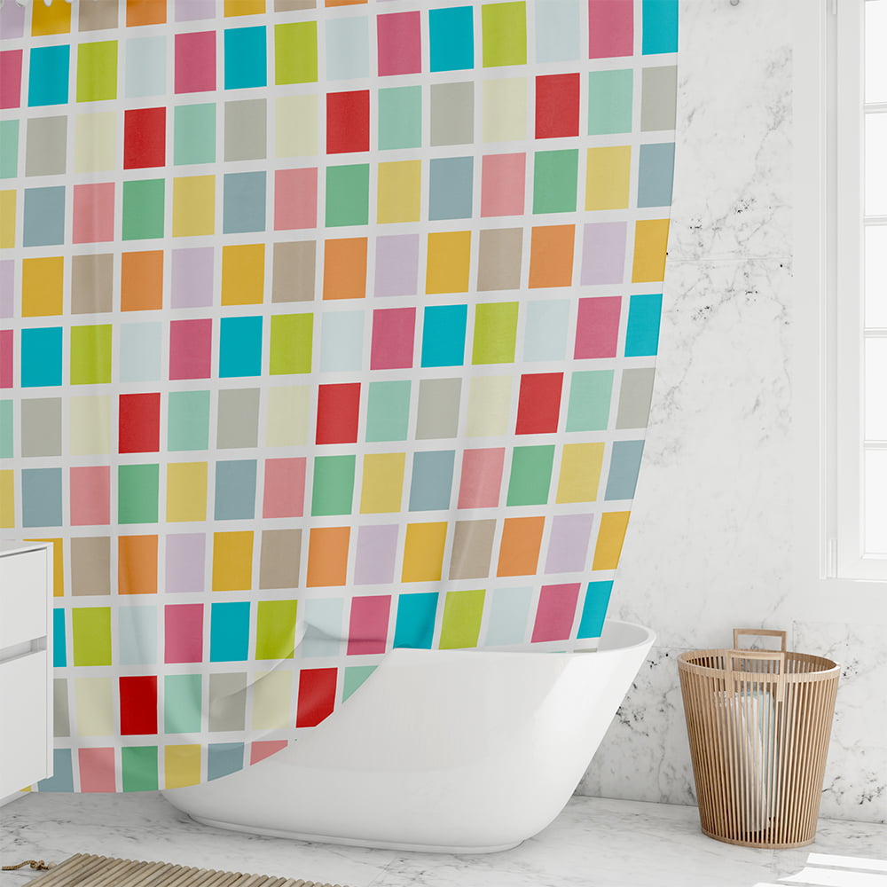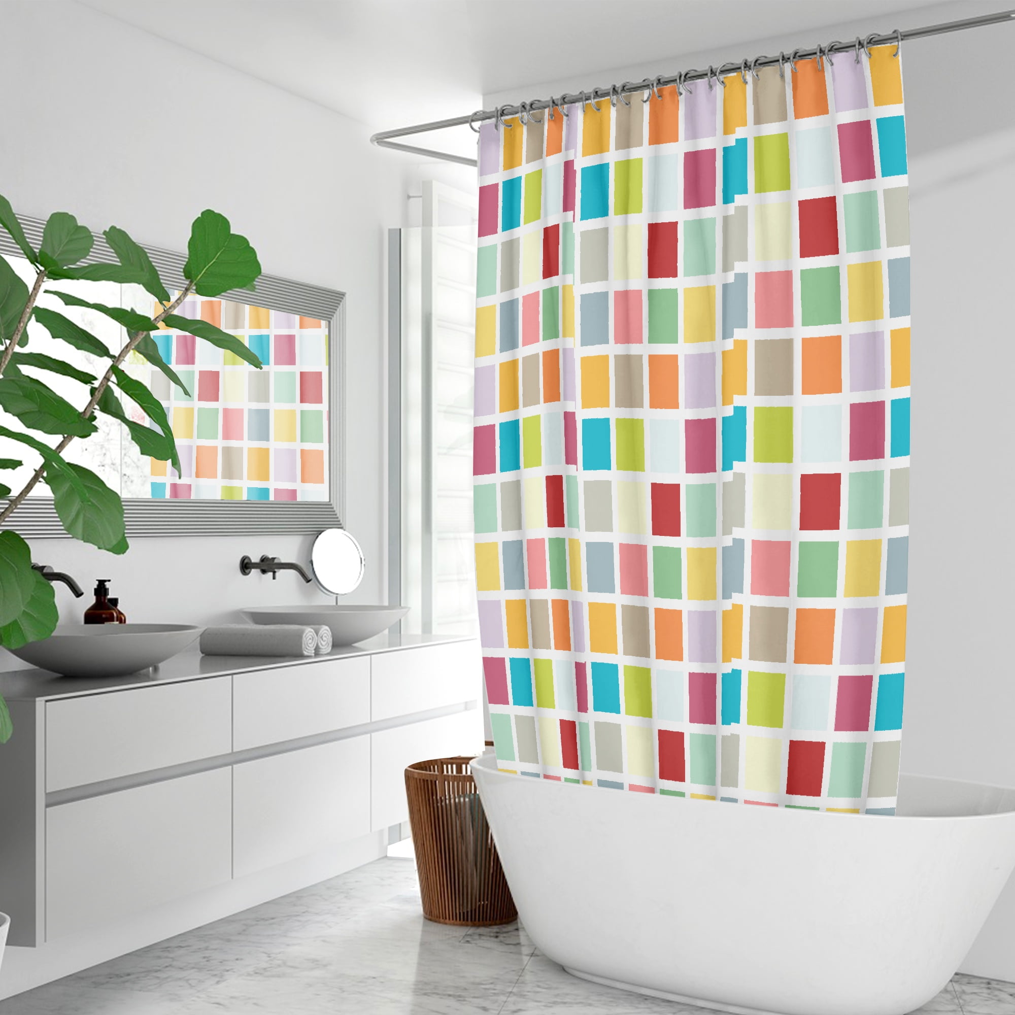 Multi Colored Pink And Green Check Shower Curtain And Bath Mat Set – Quick Drying Machine Washable Water Repellent Polyester Fabric & 12 Hooks Included – Pink Green Blue Yellow Red & Purple