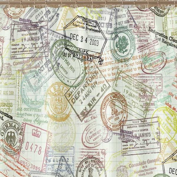 PREMIUM Brown & Green Shower Curtain – Mold Resistant Fabric – Waterproof – 71×74″- Unique Artist Designed Unisex Passport Stamps Design
