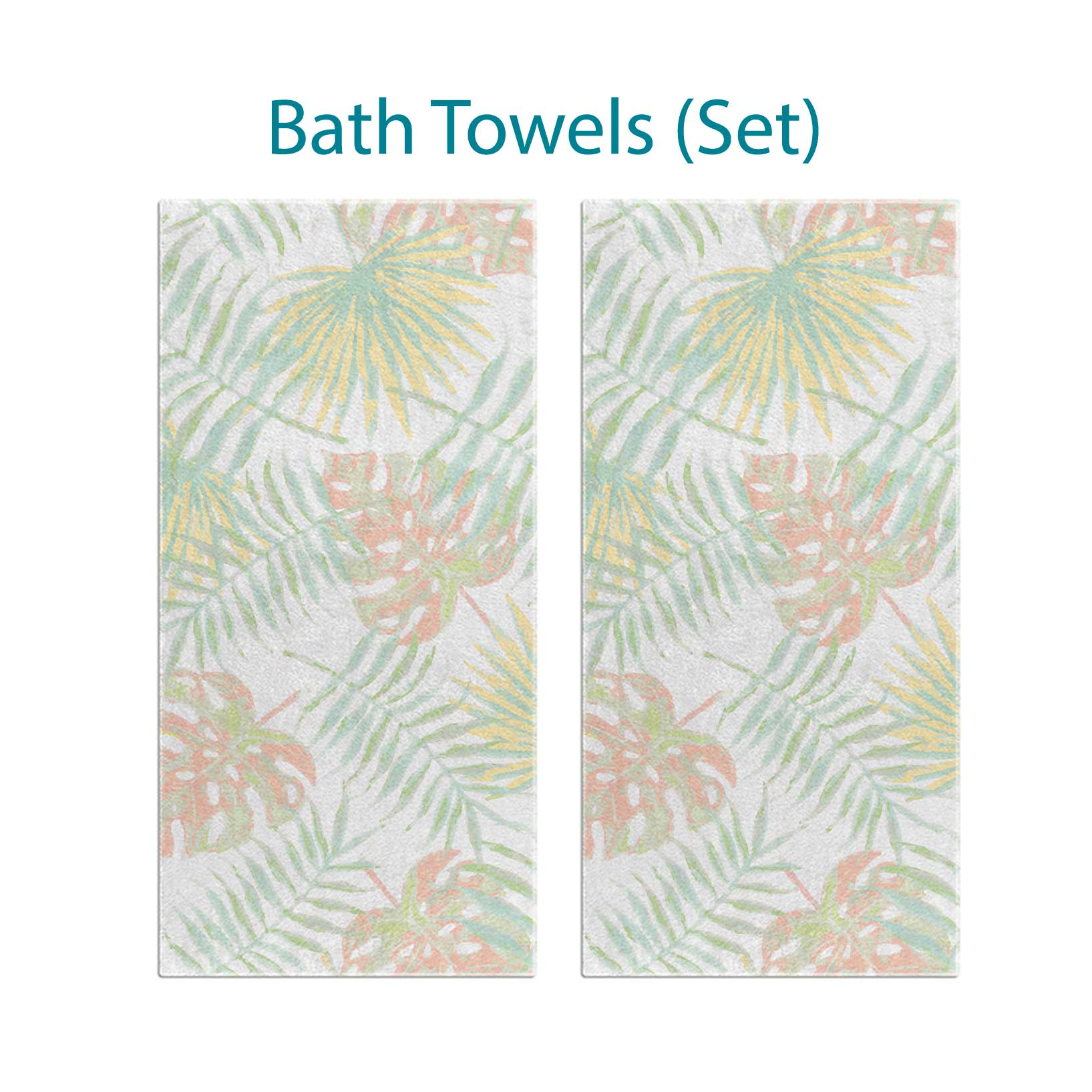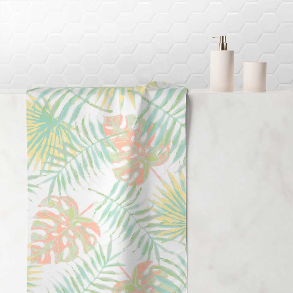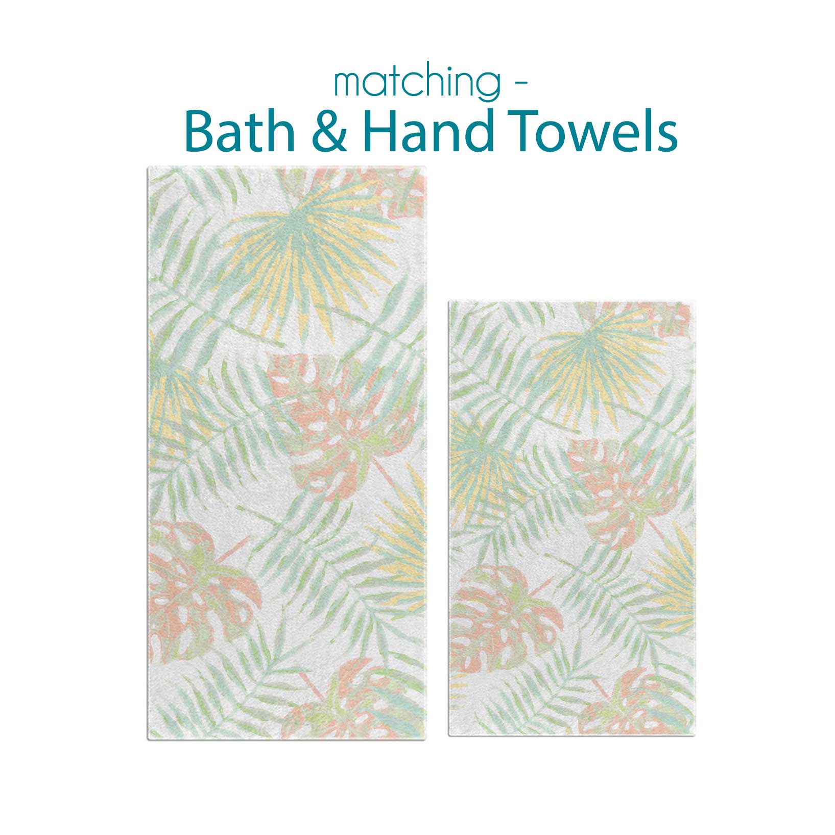 Tropical Apricot Pink And Green Palm Leaves Towel Set: Beach, Bath, Hand – Cotton And Velour